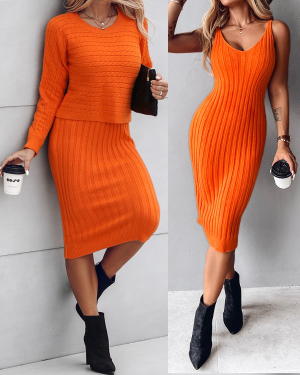 2 Piece Long Sleeve Cable Knit Sweater and V-Neck Slip Bodycon Midi Dress