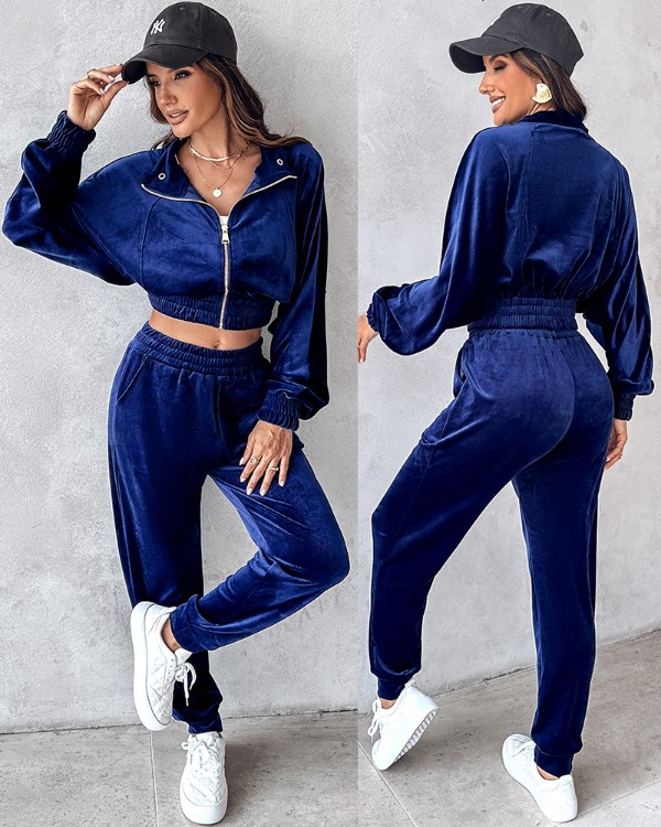 2 Piece Velvet Lounge Outfits Zip Up Crop Sweatshirt and Cuffed Sweatpants with Pockets