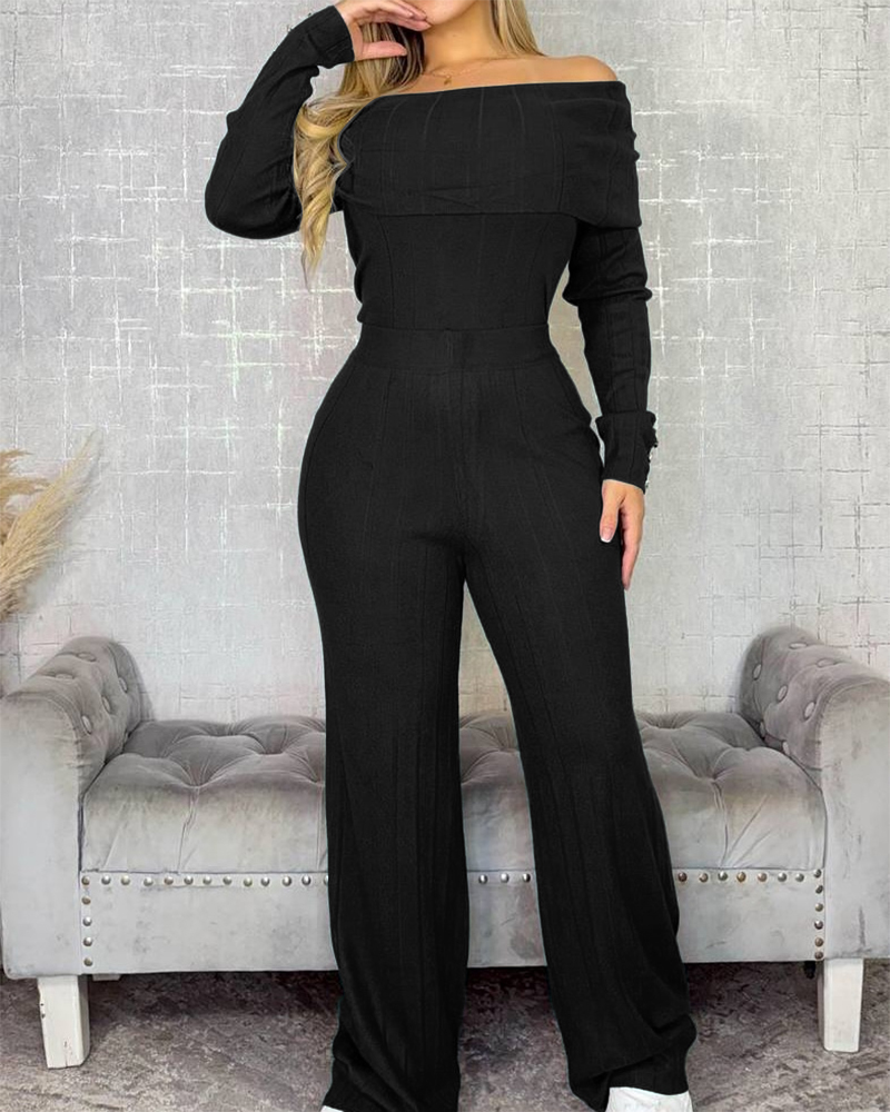 Silhouette & Fit: Slim-fit off-shoulder top highlights the neckline, while wide-leg pants with elastic waist provide ease of movement and figure-friendly balance.