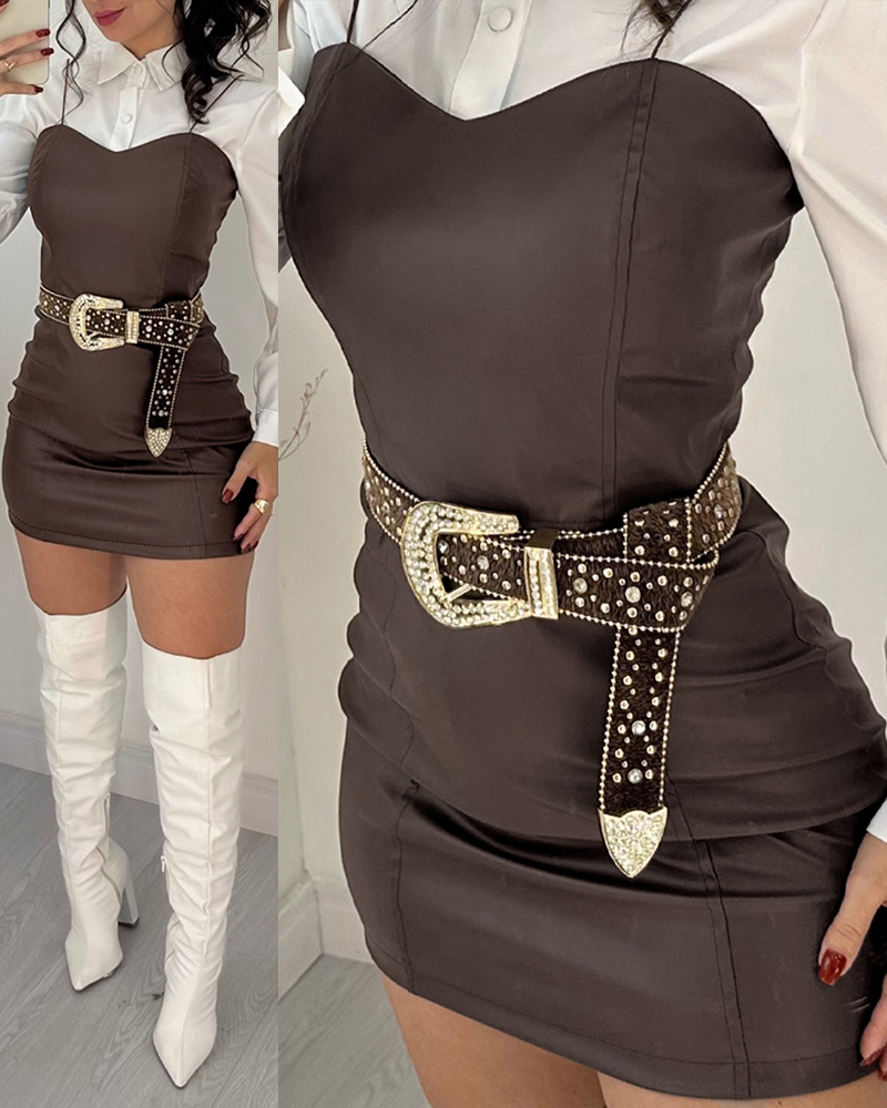 2 Pieces Outfit Turn-down Collar Long Sleeve Blouses and Casual Spaghetti Straps PU Leather Skirt