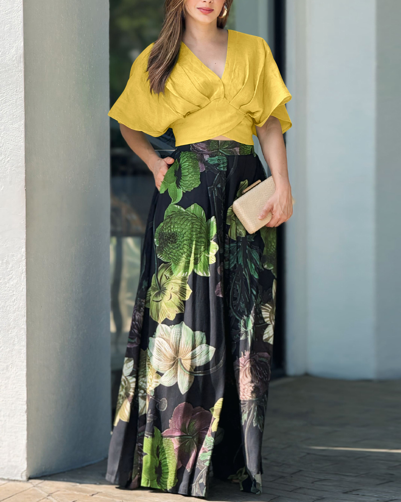 2 Pieces V Neck Short Sleeve Ruched Top and Floral Print Pocket Design Wide Leg Pants Sets