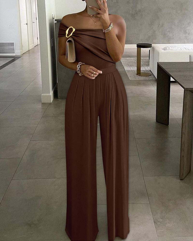 Cold Shoulder Ruched Buckle Wide Leg Jumpsuit