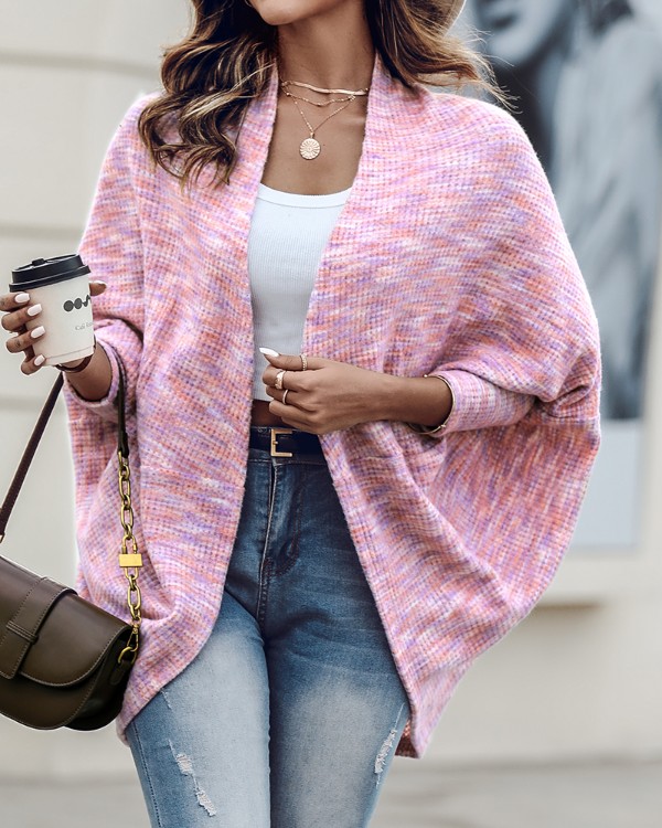 Colorful Waffle Knit Open Front Coat Batwing Long Sleeve Cardigan