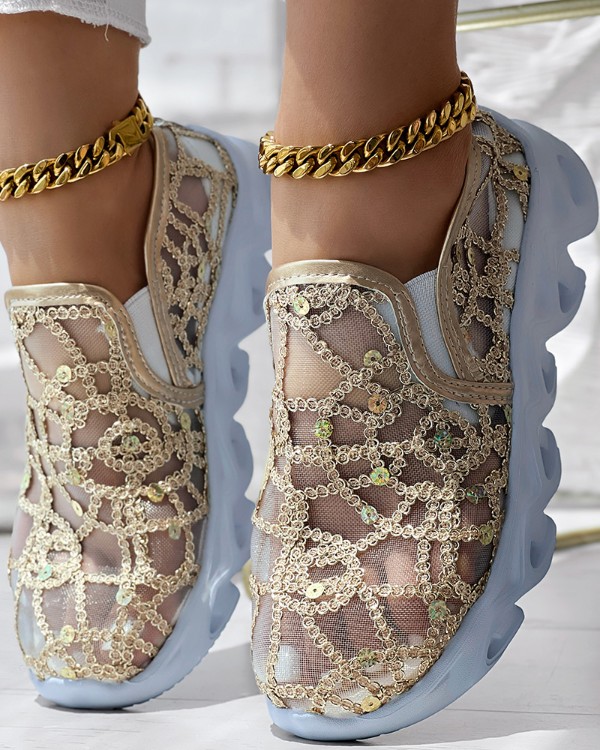 Contrast Sequin Sheer Mesh Patch Breathable Sneakers