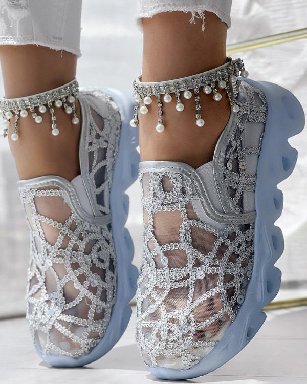 Contrast Sequin Sheer Mesh Patch Breathable Sneakers