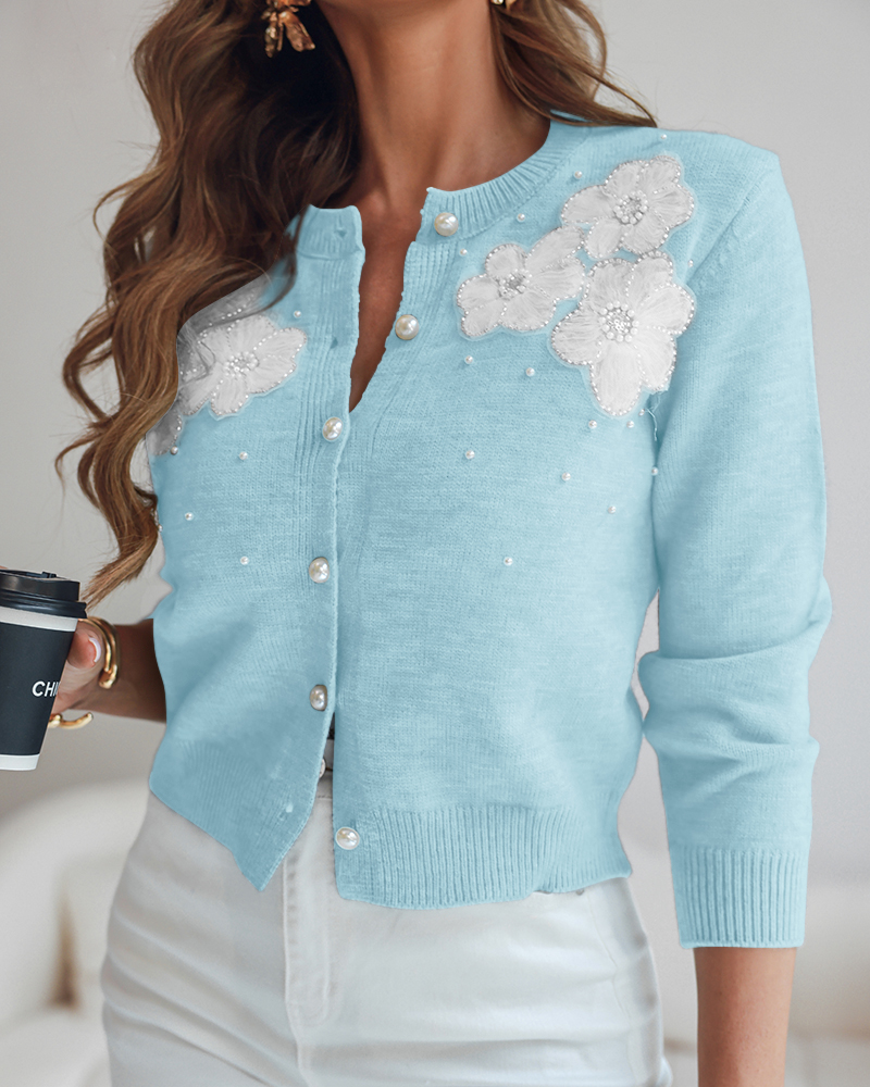 Floral Applique & Pearls Decor Round Neck Single Breasted Knit Cardigan Casual Crop Sweater Coat