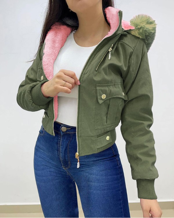 Fuzzy Trim Jacket Hooded Zip Up Fleece Lined Coat Outwear with Pockets