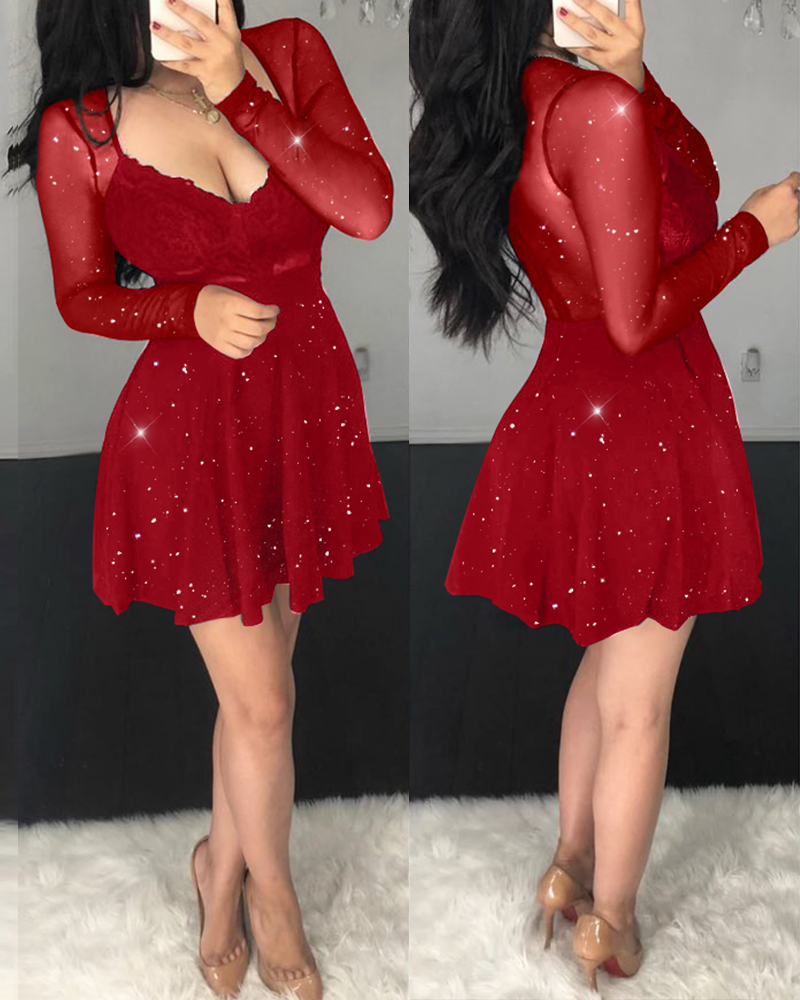 Glitter Deep V Neck Sheer Mesh & Lace Spliced Long Sleeve Mini Dress Cinched Waist Zipper Back Umbrella Hem Dress