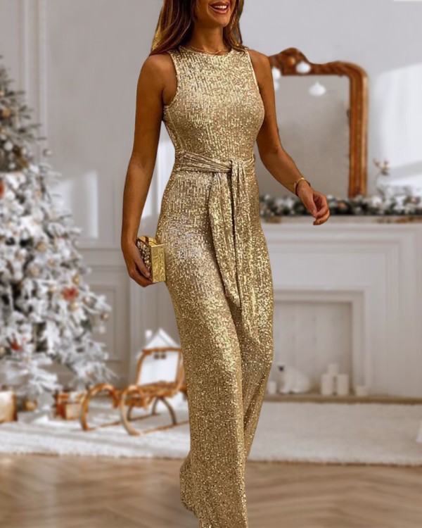 Glitter Round Neck Sleeveless Backless Sequins Jumpsuit