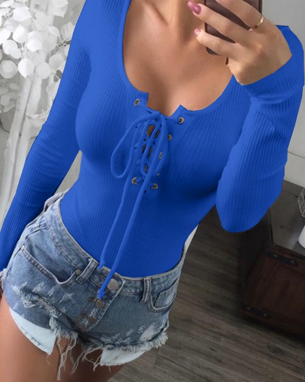 Lace-up Deep U-Neck Bodysuit Long Sleeve Slim Fit Going Out Tops