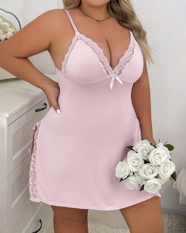 Plus Size Bowknot Decor Lace Patch Slit Sleep Dress
