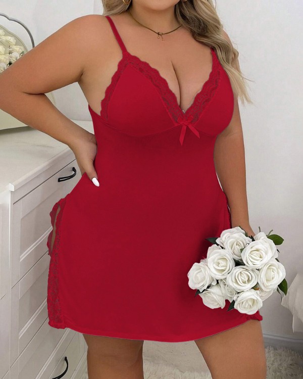 Plus Size Bowknot Decor Lace Patch Slit Sleep Dress