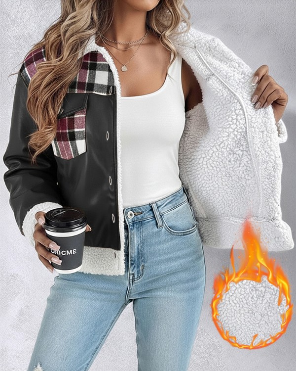 PU Leather Plaid Print Spliced Turn-down Collar Button Front Thermal Lined Jacket Casual Faux Shearling Trim Flap Pockets Design Crop Warm Coat