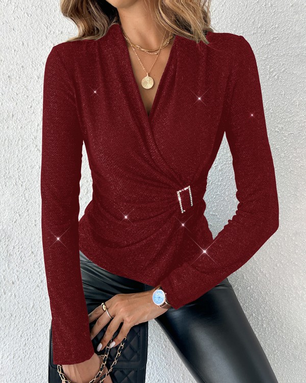 Rhinestone V-Neck Skinny Sweater Front Buckle Ruched Casual Top