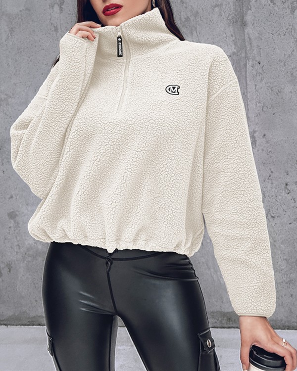 Stand Collar Drop Shoulder Half Zipper Sweatshirt Casual Drawstring Hem Faux Shearling Top