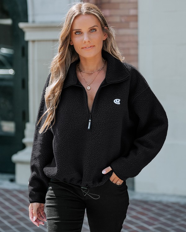 Stand Collar Drop Shoulder Half Zipper Sweatshirt Casual Drawstring Hem Faux Shearling Top