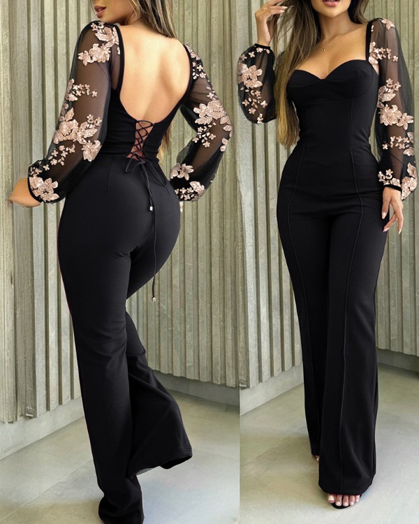 Design Details: Features backless lace-up closure, sequin-embellished mesh sleeves with slightly gathered cuffs, and front seams, blending chic elegance with delicate layered details.