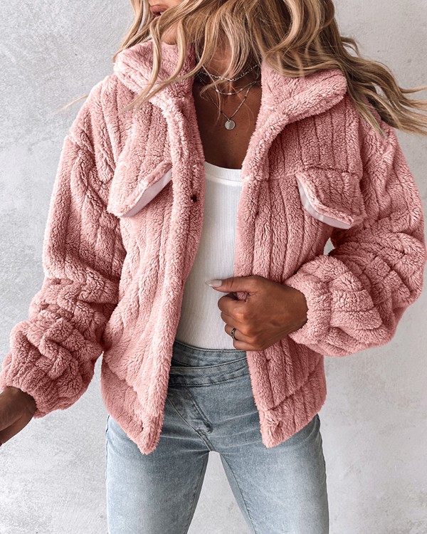 Textured Striped Turn-down Collar Button Front Elastic Cuff and Hem Teddy Fleece Jacket With Decorative Flap Pockets