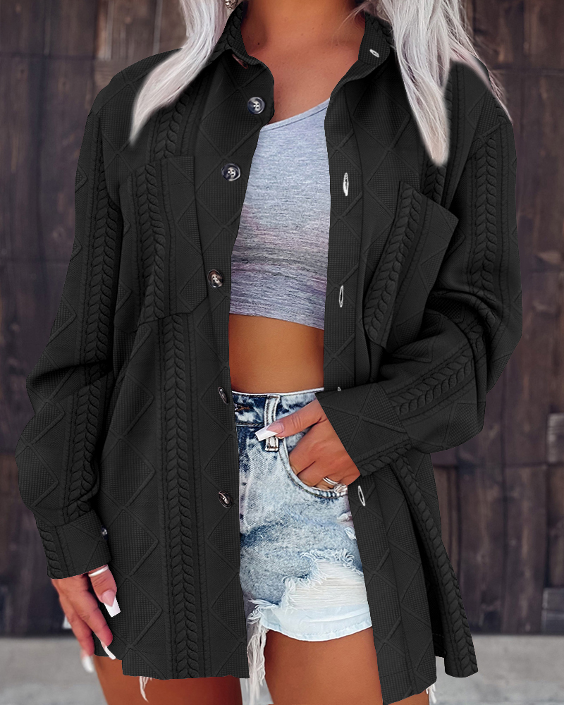 Turn-down Collar Button Front Drop Shoulder Jacket Casual Pockets Design Argyle & Cable Textured Shirt Coat