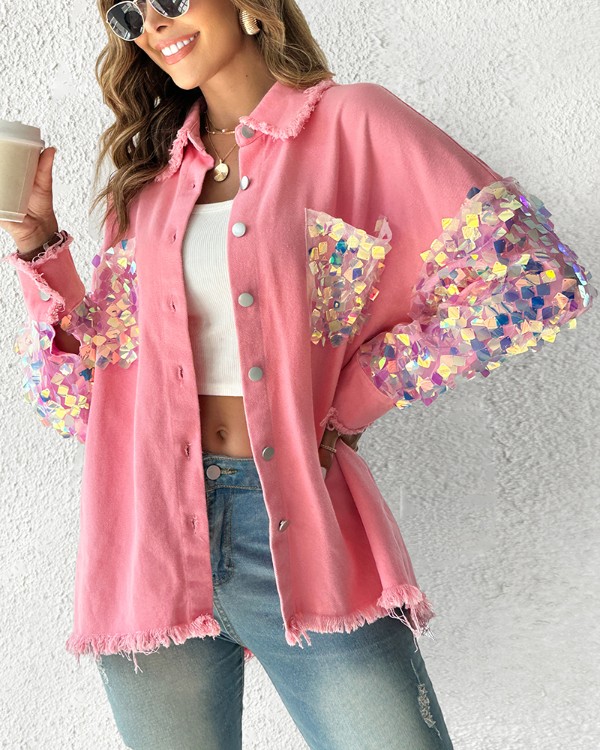 3. Design Details: Turn-down collar, button front closure, and raw hem details create subtle edge. Contrast sequin patches on sleeves and chest pockets add visual interest, making this shacket both playful and chic.