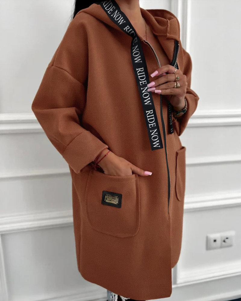 Zip Up Pockets Design Letter Tape Trim Hoodie Jacket Casual Drop Shoulder Mid-Length Coat